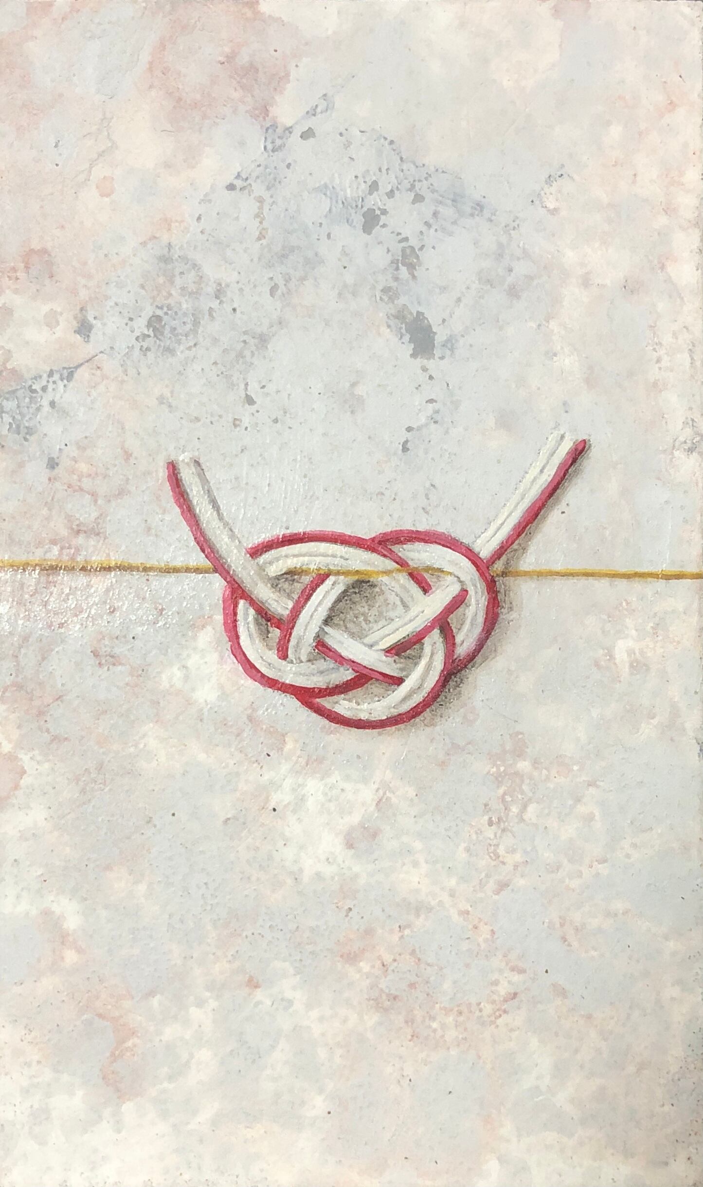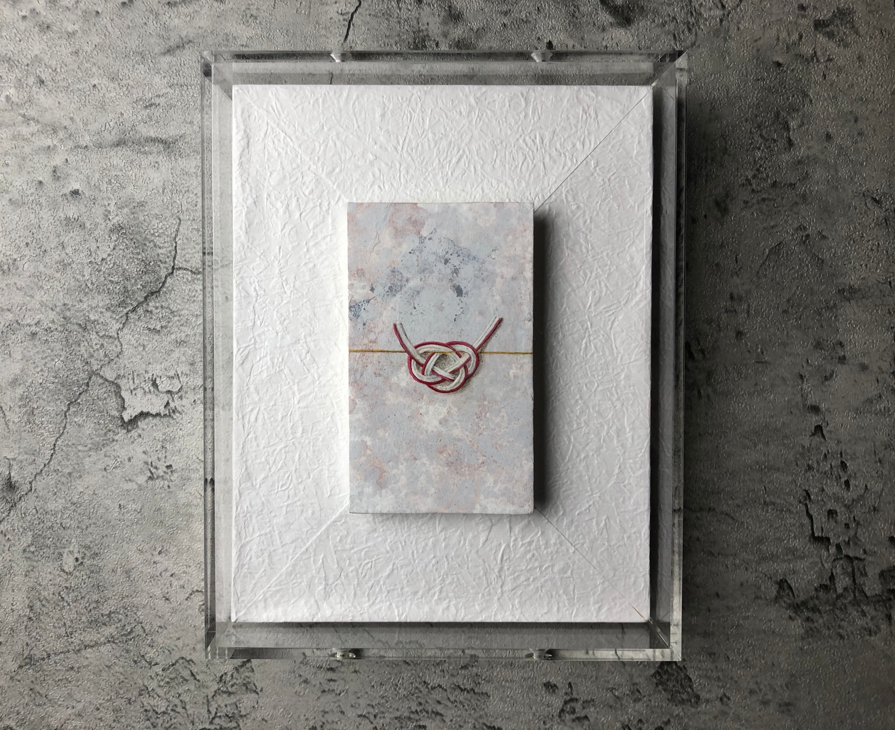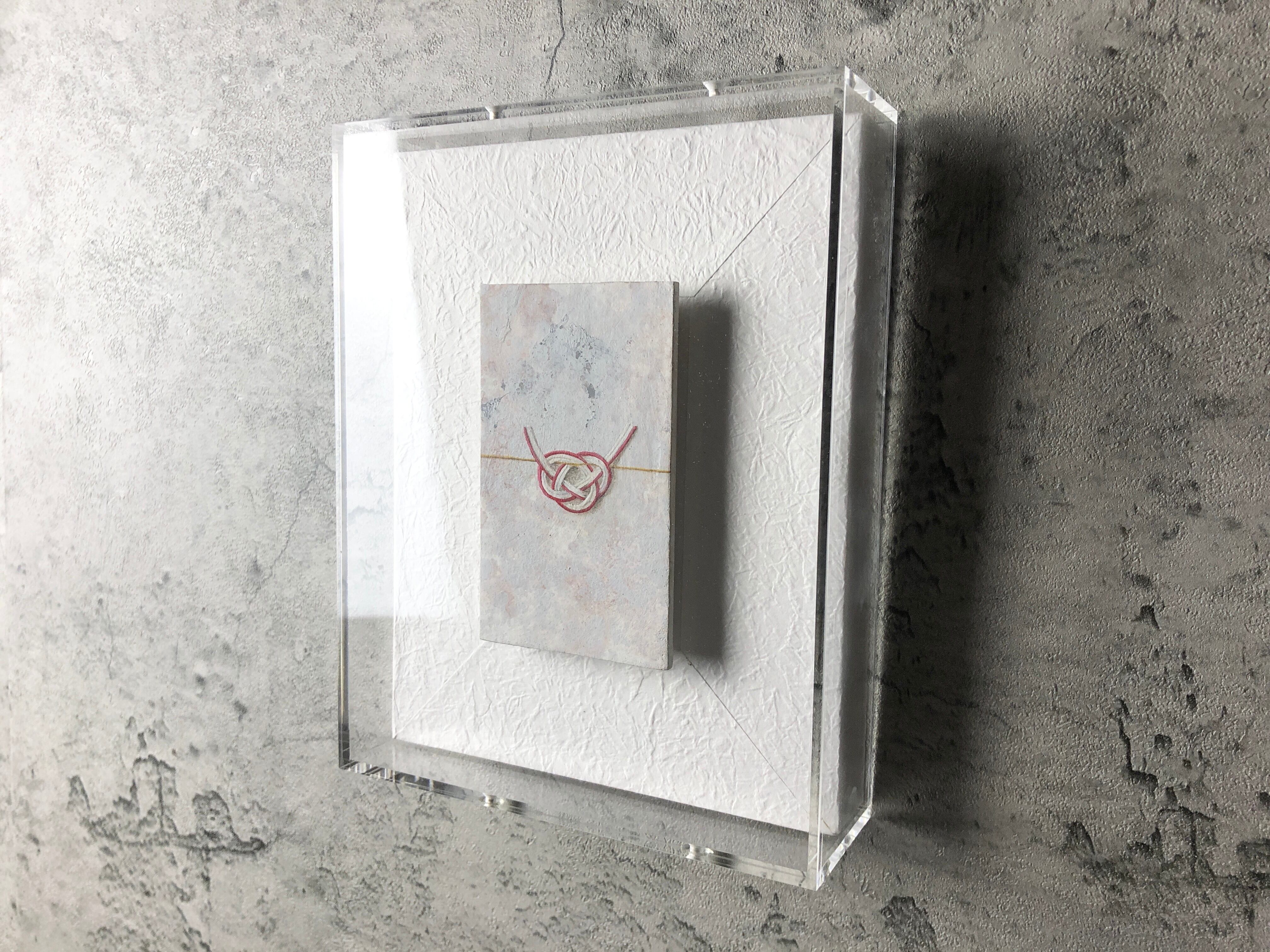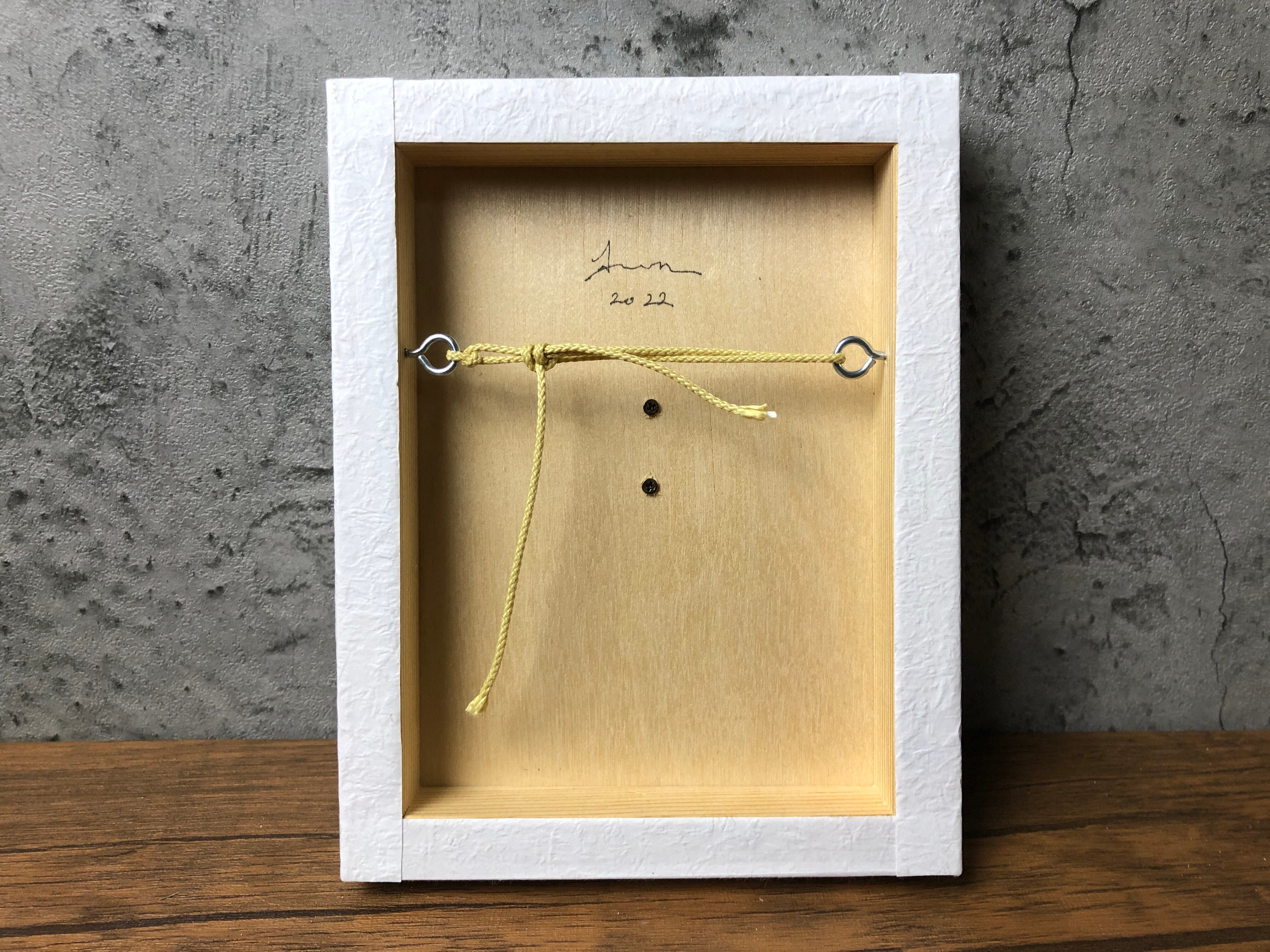 ・作品裏面にヒートンとケブラー紐を取り付けています。額無しの状態で壁掛け展示が可能です。